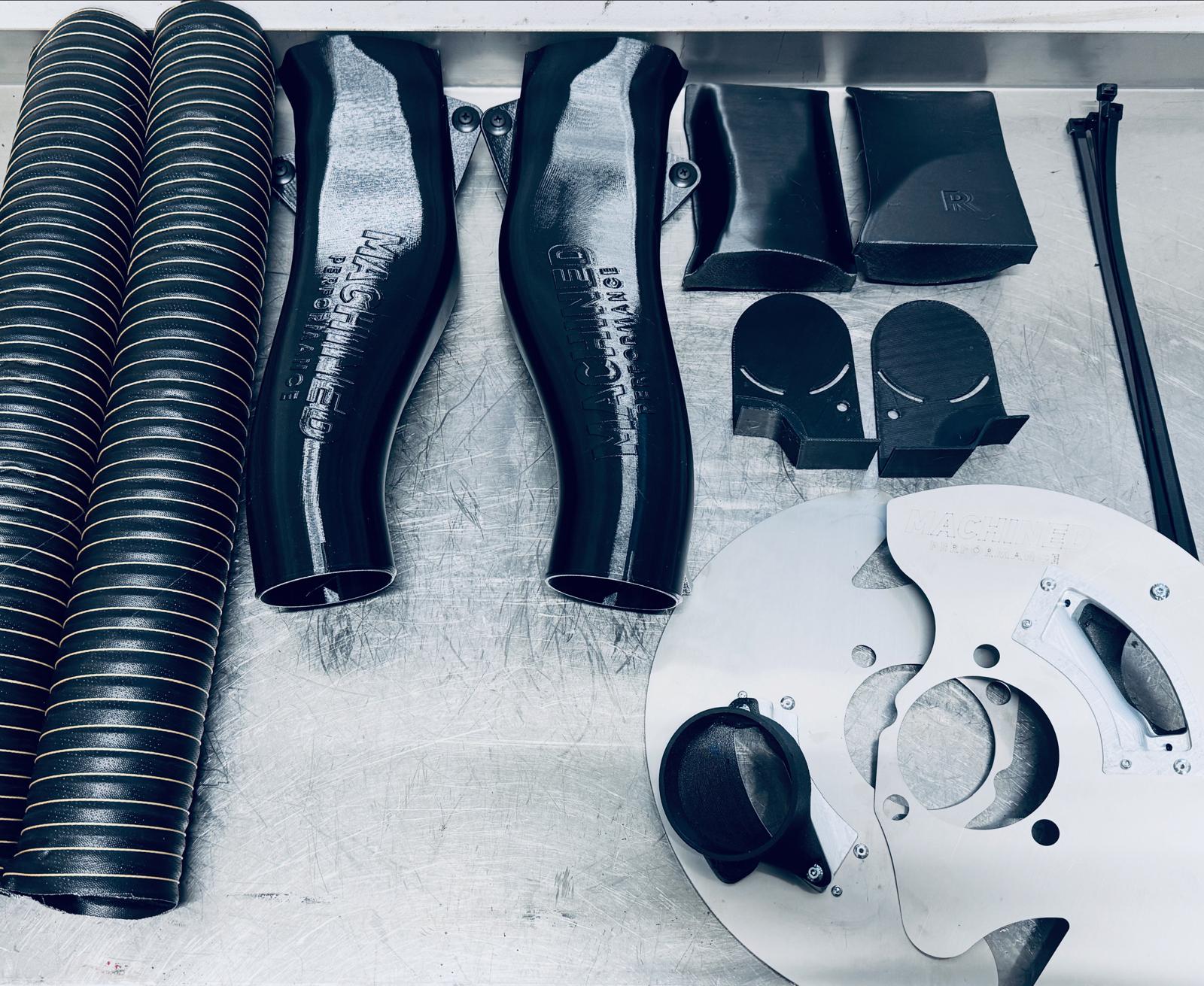 Nasze **wyścigowe wloty powietrza do chłodzenia hamulców** zostały zaprojektowane z unikalnego połączenia **stali nierdzewnej (inox)** i **kompozytu węglowego (PA-CF)**, aby zapewnić maksymalną wydajność w kierowaniu przepływu powietrza bezpośrednio na tarcze hamulcowe. W przeciwieństwie do innych systemów chłodzenia hamulców dostępnych na rynku, te wloty oferują niezrównaną precyzję dostarczania powietrza dokładnie tam, gdzie jest ono potrzebne, co zapewnia optymalne odprowadzanie ciepła podczas intensywnych warunków wyścigowych.
